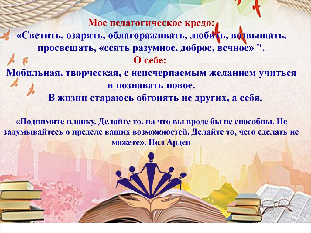 Мое педагогическое кредо:«Светить, озарять, облагораживать, любить, возвышать,