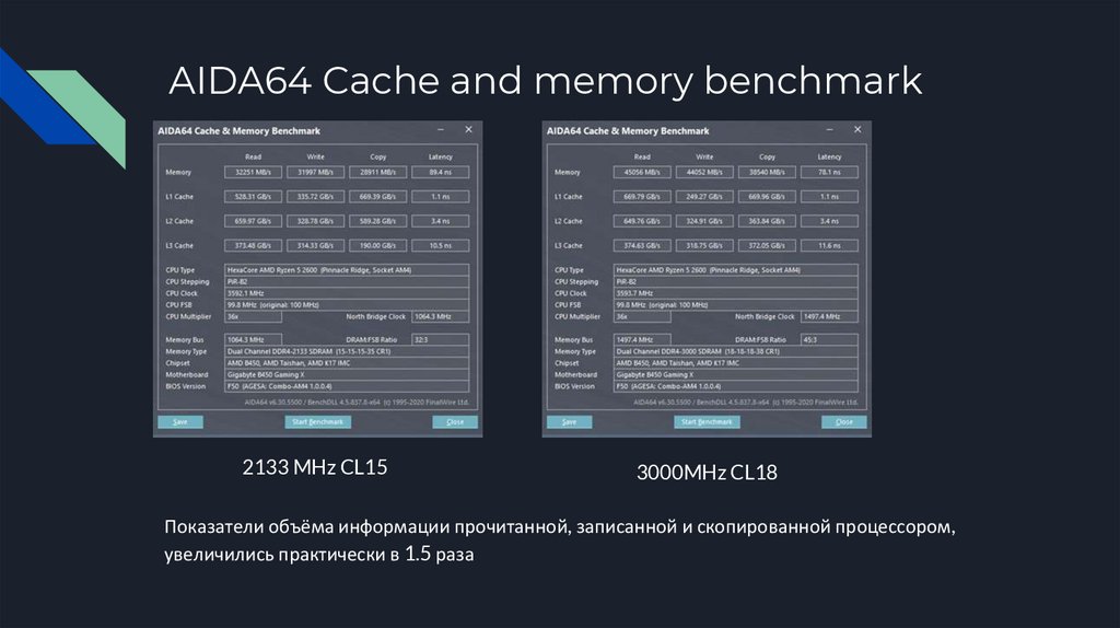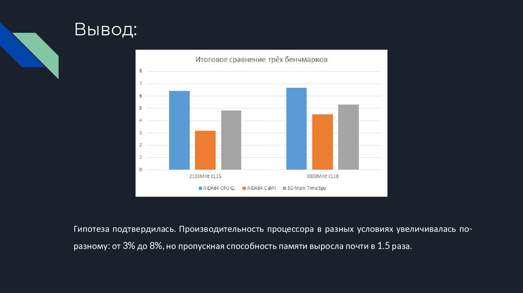 Вывод:Гипотеза подтвердилась. Производительность процессора в разных условиях увеличивалась поразному: от 3% до 8%, но пропускная способность памяти выросла почти в 1.5 раза.