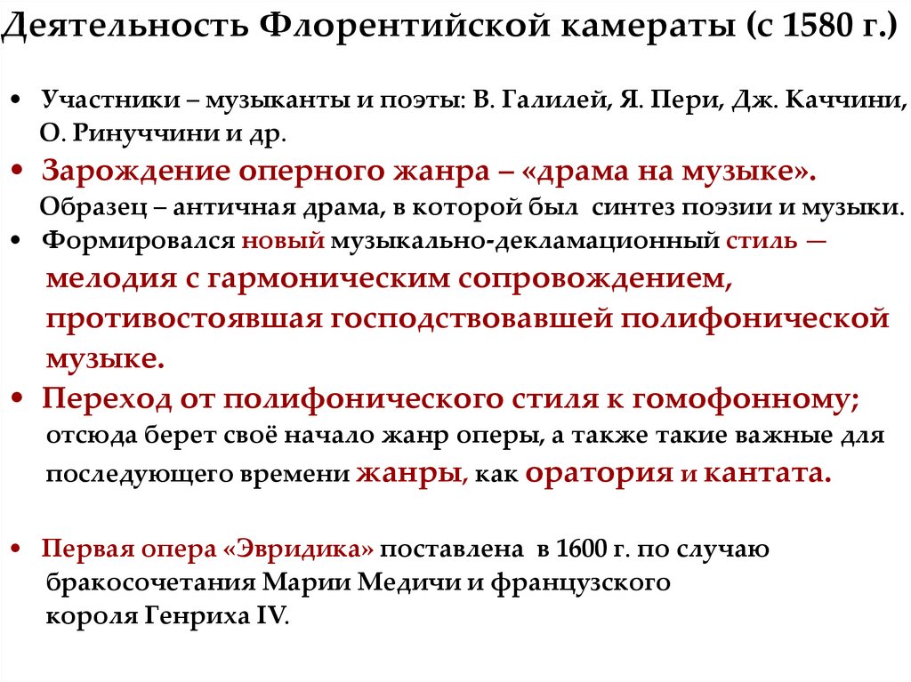 Деятельность Флорентийской камераты (с 1580 г.)• Участники – музыканты и поэты: В. Галилей, Я. Пери, Дж. Каччини,