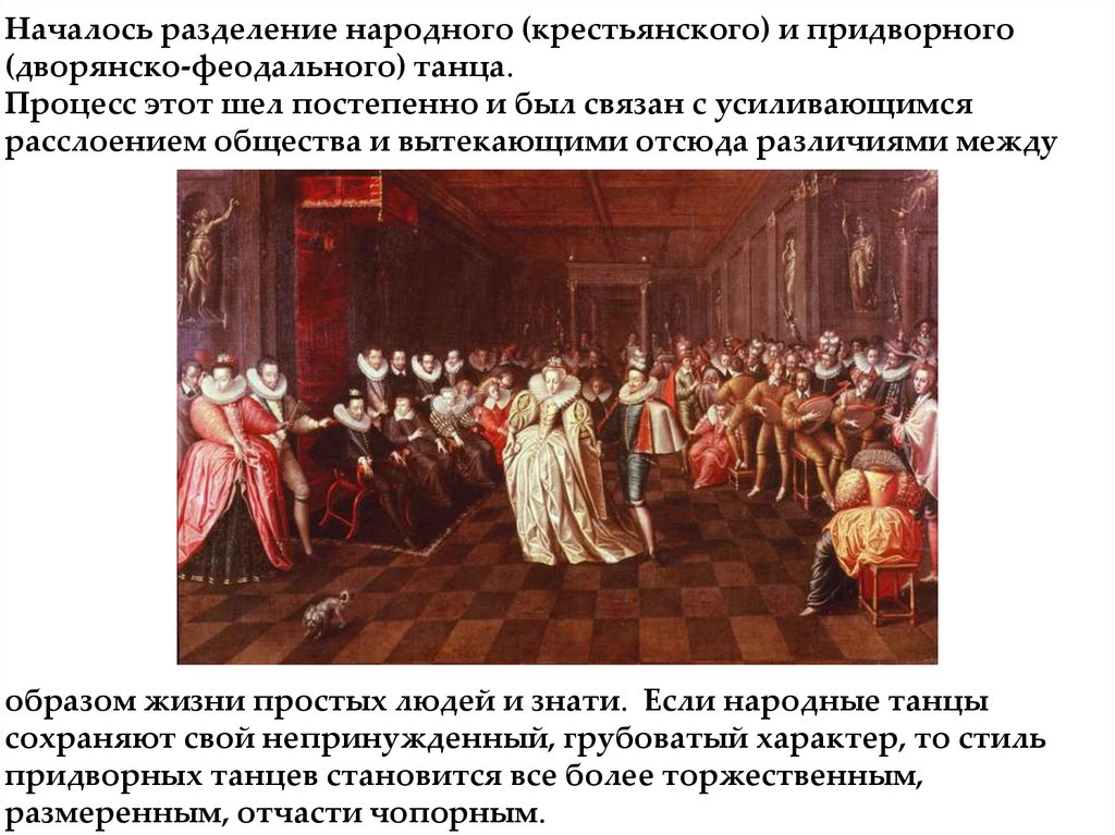 Началось разделение народного (крестьянского) и придворного(дворянско-феодального) танца.
