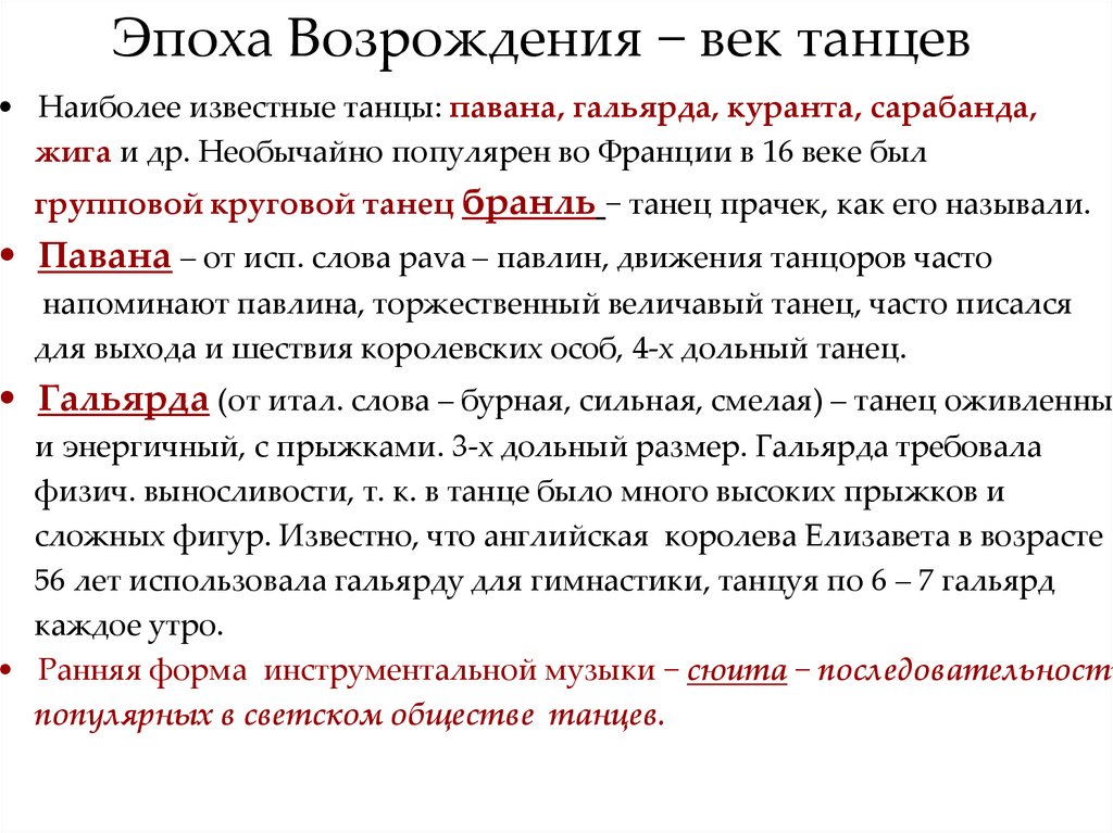 Эпоха Возрождения − век танцев• Наиболее известные танцы: павана, гальярда, куранта, сарабанда,