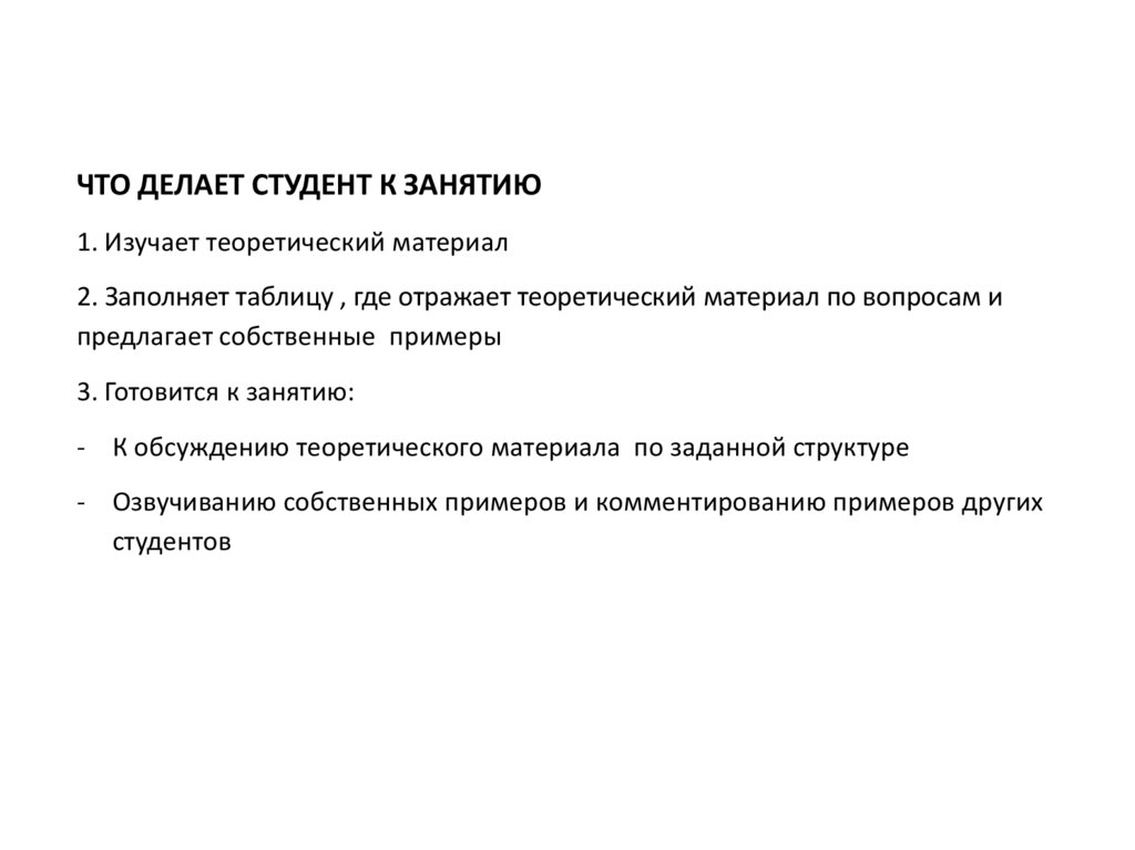 ЧТО ДЕЛАЕТ СТУДЕНТ К ЗАНЯТИЮ1. Изучает теоретический материал