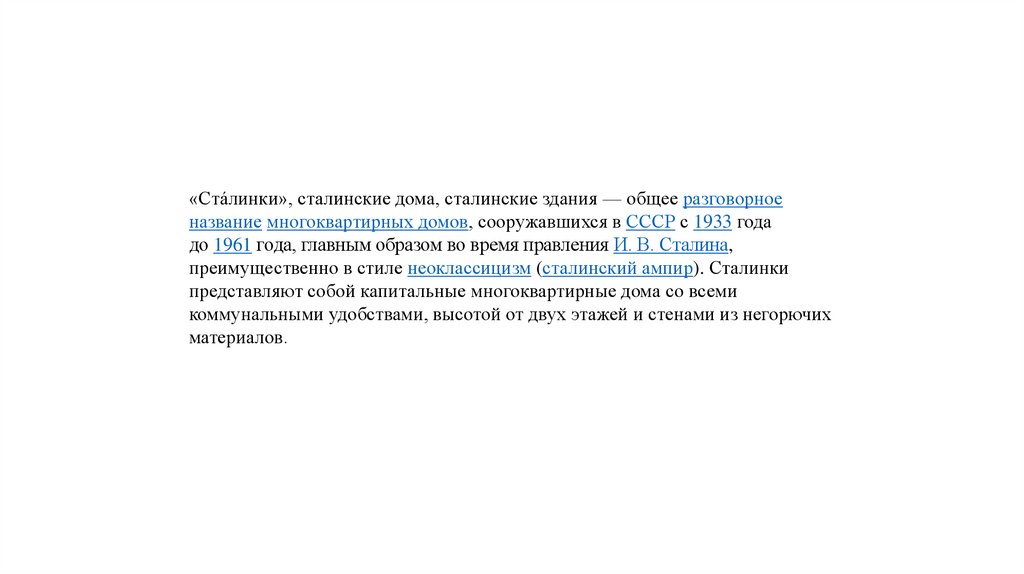 «Ста́линки», сталинские дома, сталинские здания — общее разговорноеназвание многоквартирных домов, сооружавшихся в СССР с 1933 года