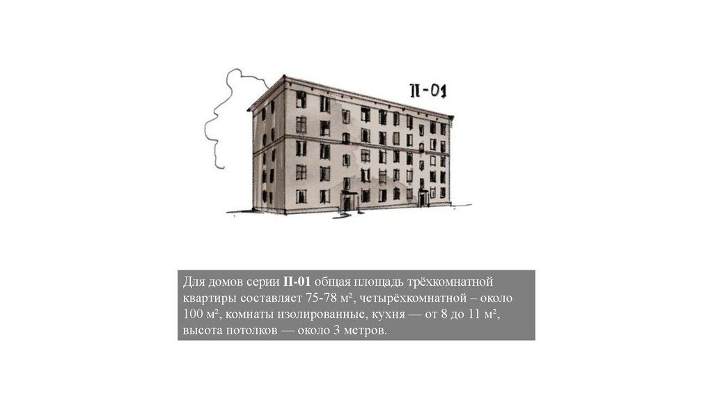 Для домов серии II-01 общая площадь трёхкомнатнойквартиры составляет 75-78 м², четырёхкомнатной – около
