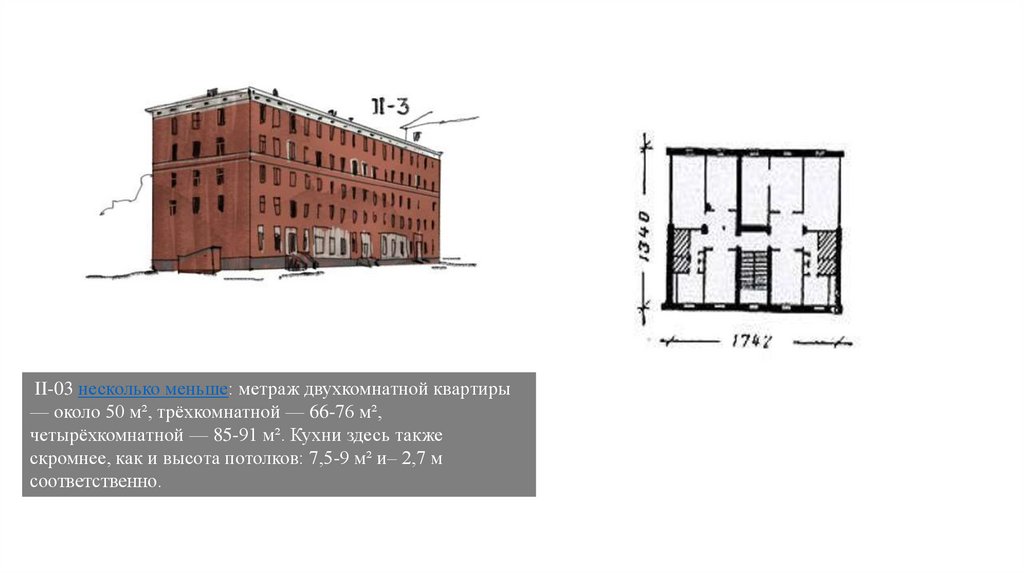 II-03 несколько меньше: метраж двухкомнатной квартиры— около 50 м², трёхкомнатной — 66-76 м²,