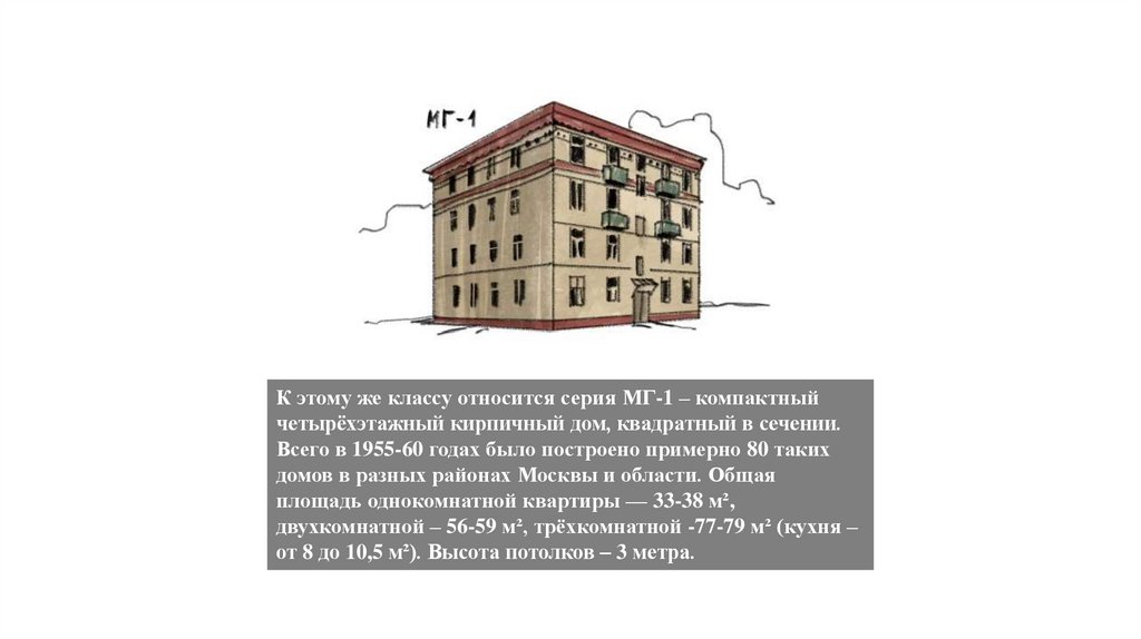 К этому же классу относится серия МГ-1 – компактныйчетырёхэтажный кирпичный дом, квадратный в сечении.