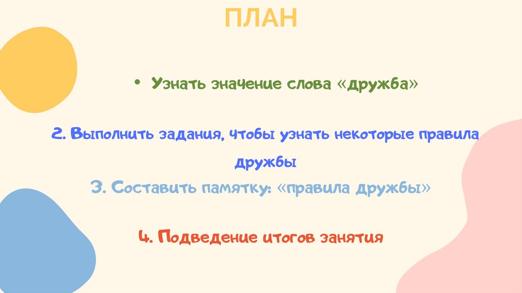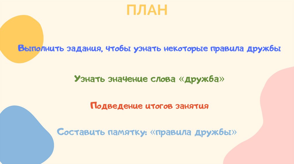 ПЛАНВыполнить задания, чтобы узнать некоторые правила дружбы