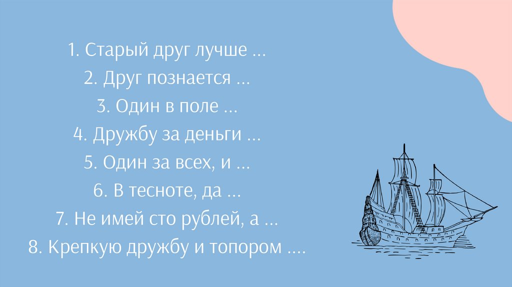 1. Старый друг лучше новых двух.2. Друг познается в беде.