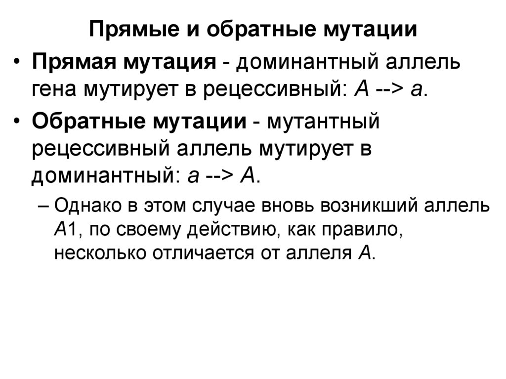 Прямые и обратные мутации• Прямая мутация - доминантный аллель