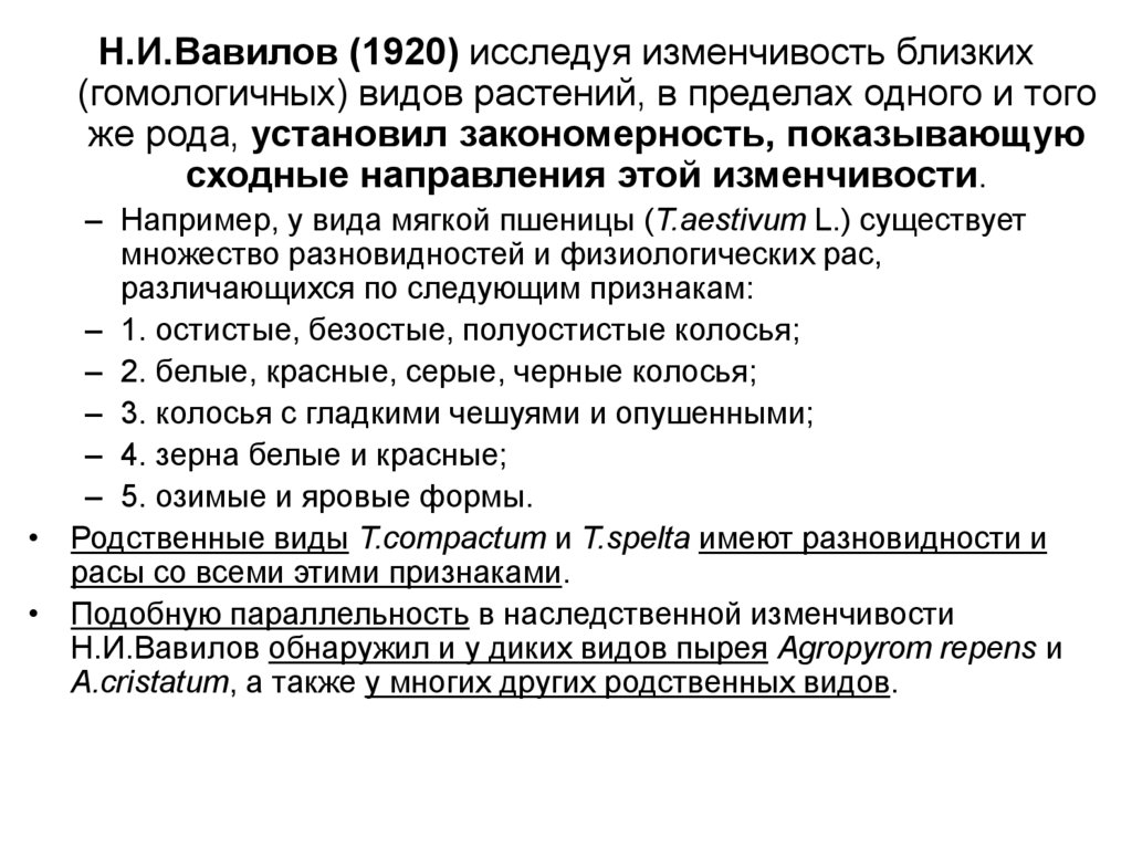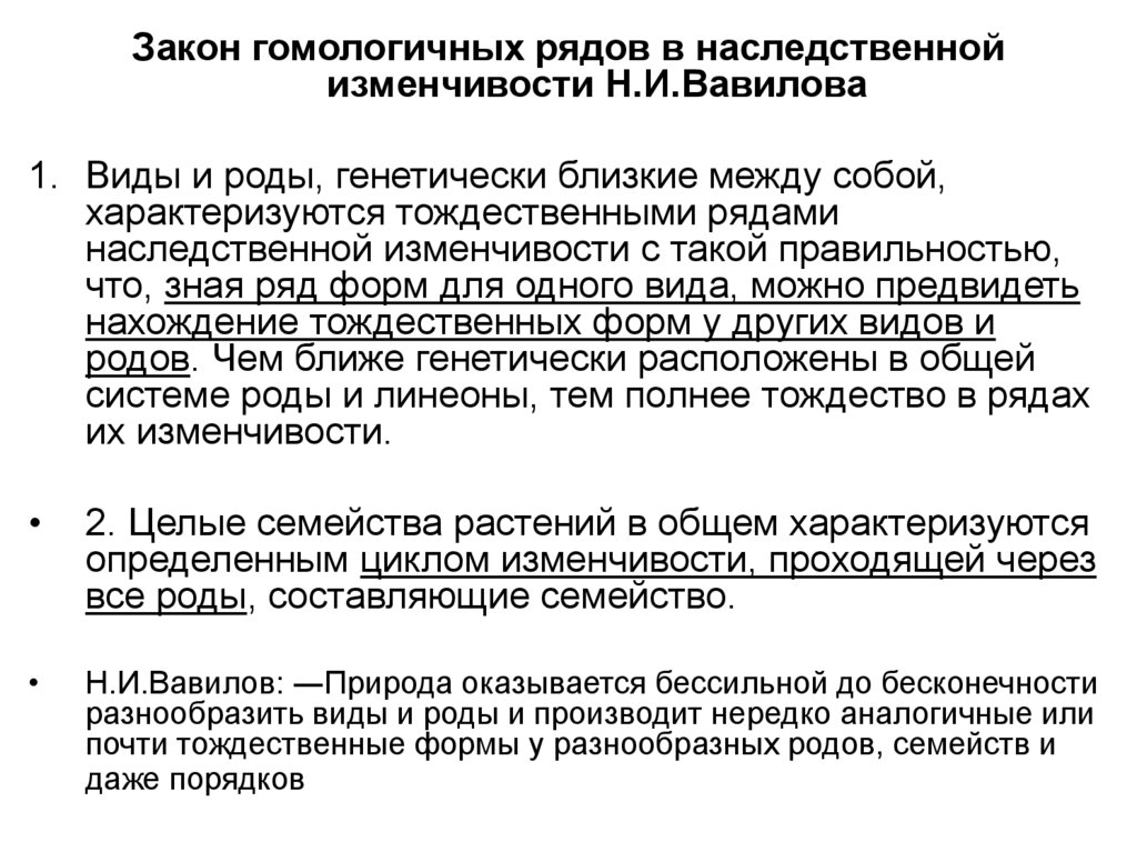 Н.И.Вавилов (1920) исследуя изменчивость близких(гомологичных) видов растений, в пределах одного и того
