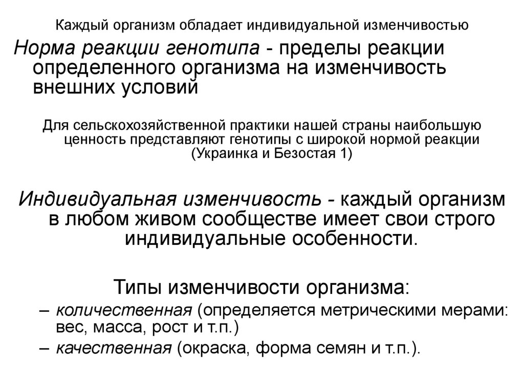 Каждый организм обладает индивидуальной изменчивостьюНорма реакции генотипа - пределы реакции