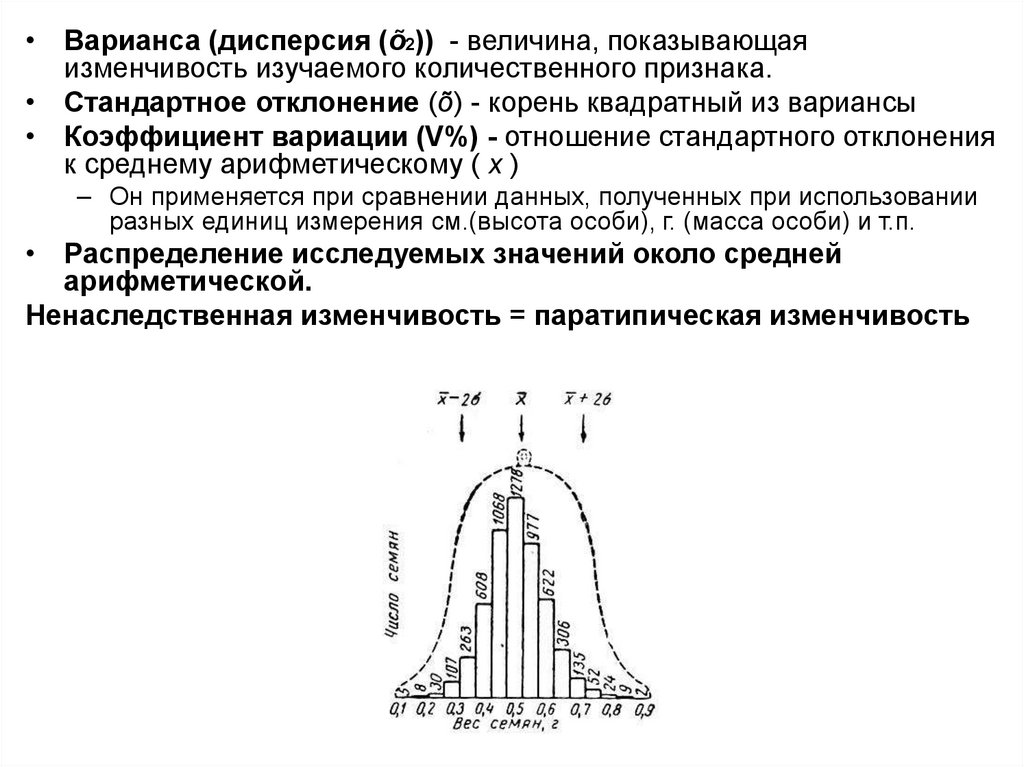 • Варианса (дисперсия (õ2)) - величина, показывающаяизменчивость изучаемого количественного признака.