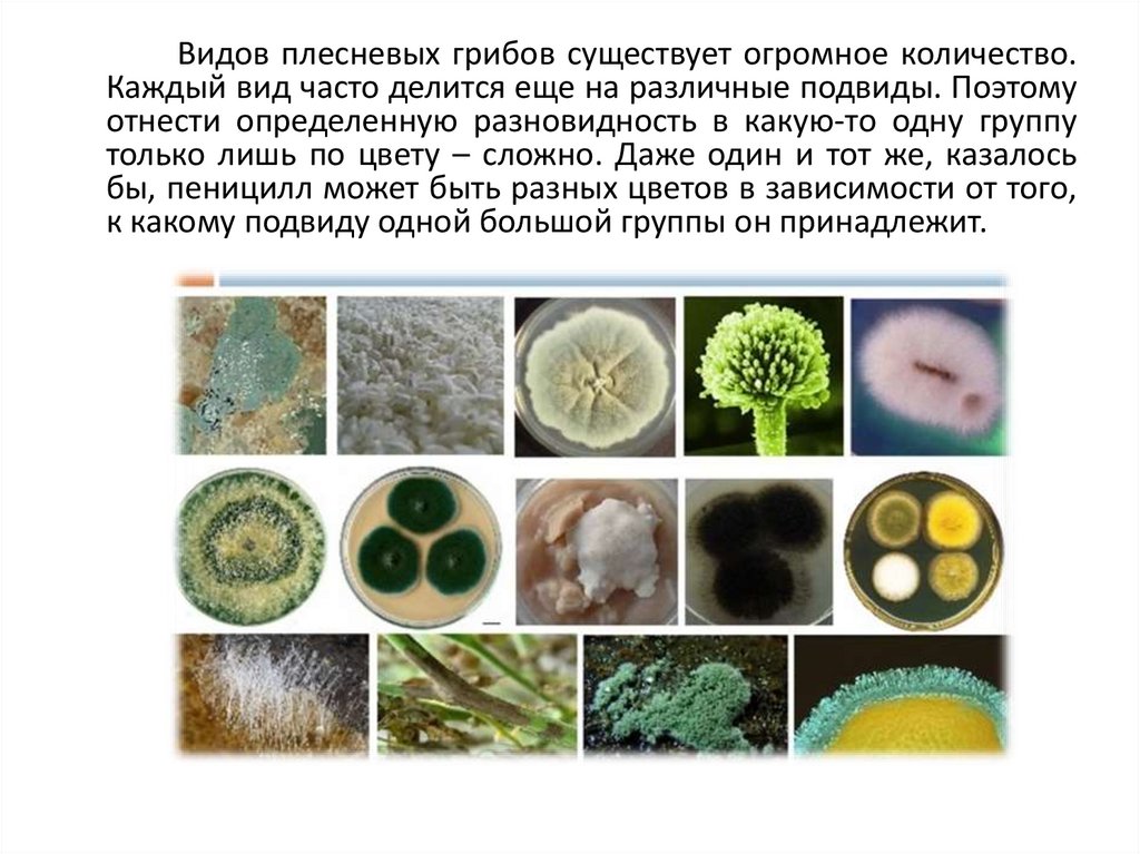 Видов плесневых грибов существует огромное количество.Каждый вид часто делится еще на различные подвиды. Поэтому