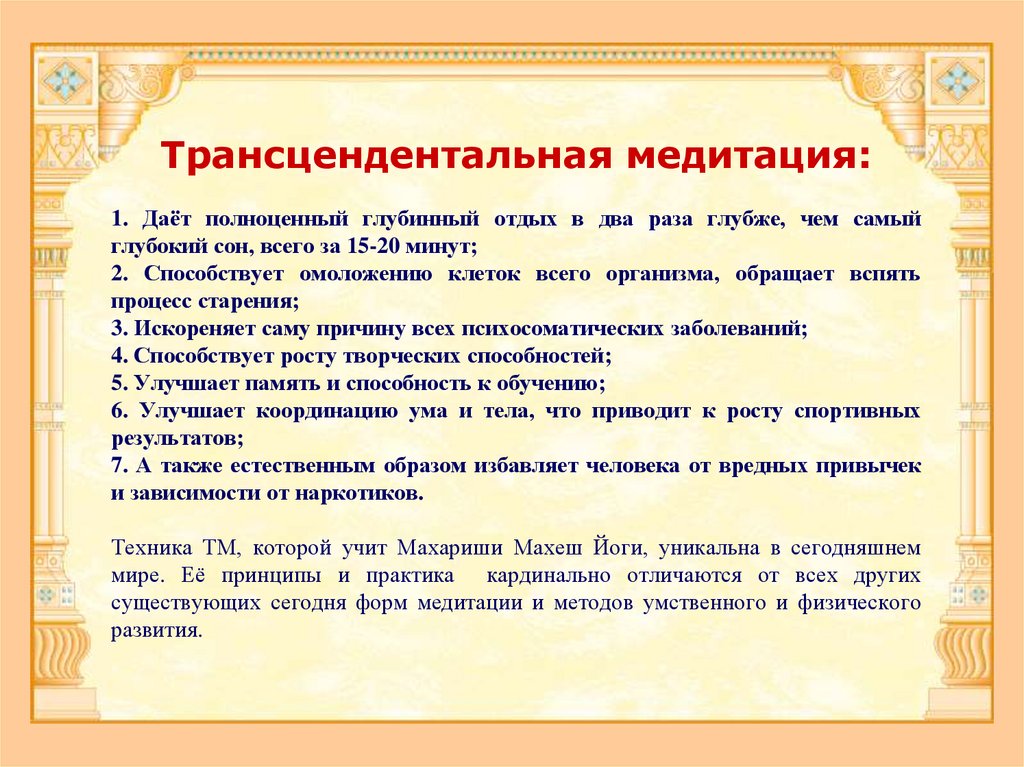 Трансцендентальная медитация:1. Даёт полноценный глубинный отдых в два раза глубже, чем самый