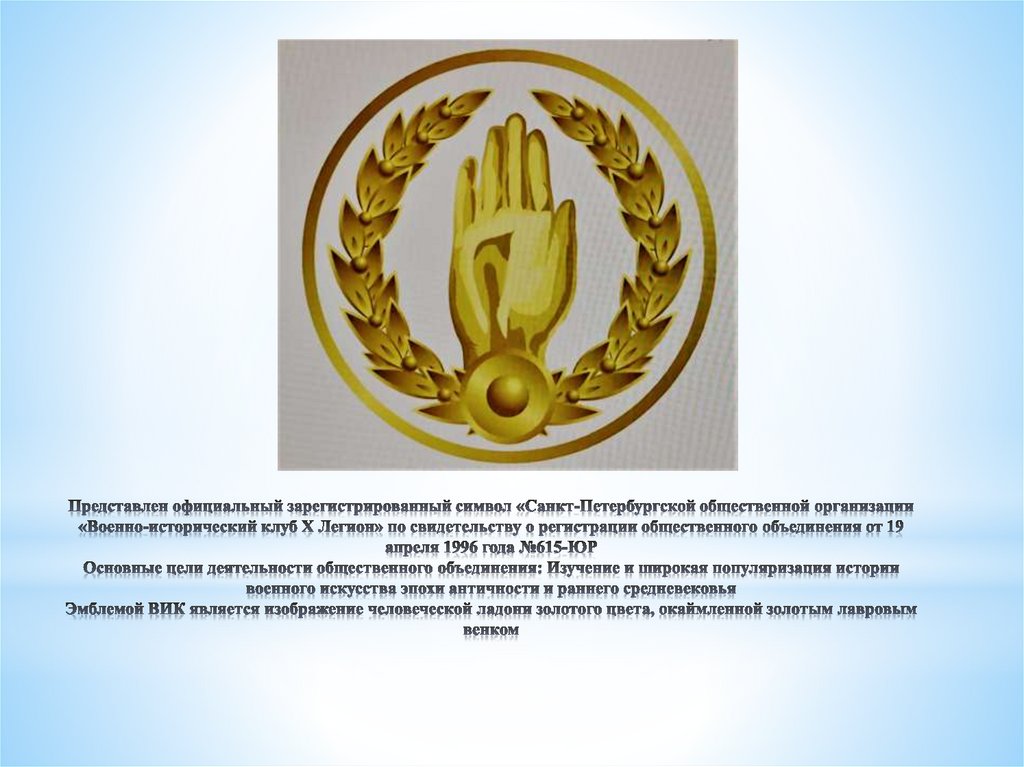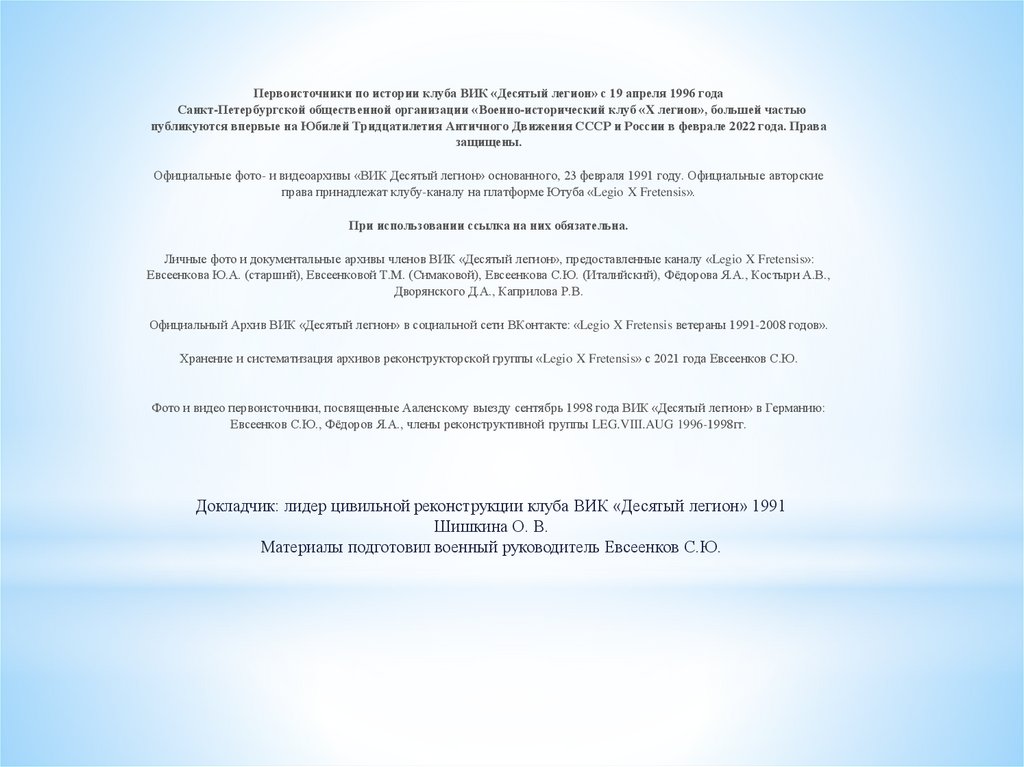 Первоисточники по истории клуба ВИК «Десятый легион» с 19 апреля 1996 годаСанкт-Петербургской общественной организации «Военно-исторический клуб «X легион», большей частью