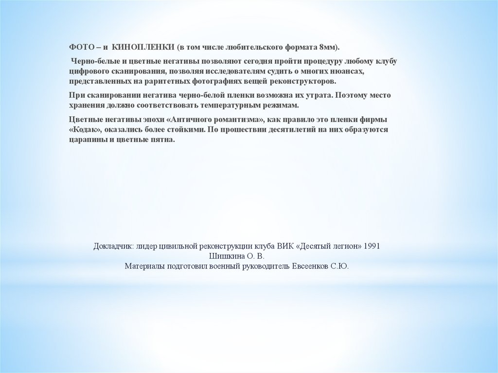 ФОТО – и КИНОПЛЕНКИ (в том числе любительского формата 8мм).Черно-белые и цветные негативы позволяют сегодня пройти процедуру любому клубу