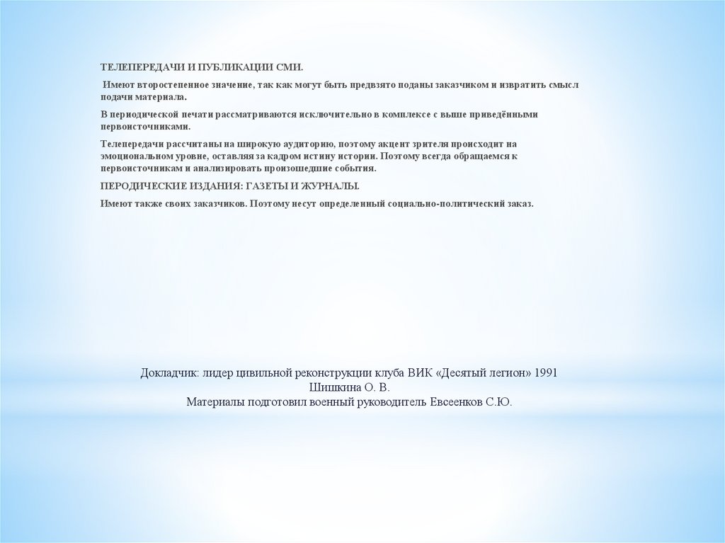 ТЕЛЕПЕРЕДАЧИ И ПУБЛИКАЦИИ СМИ.Имеют второстепенное значение, так как могут быть предвзято поданы заказчиком и извратить смысл