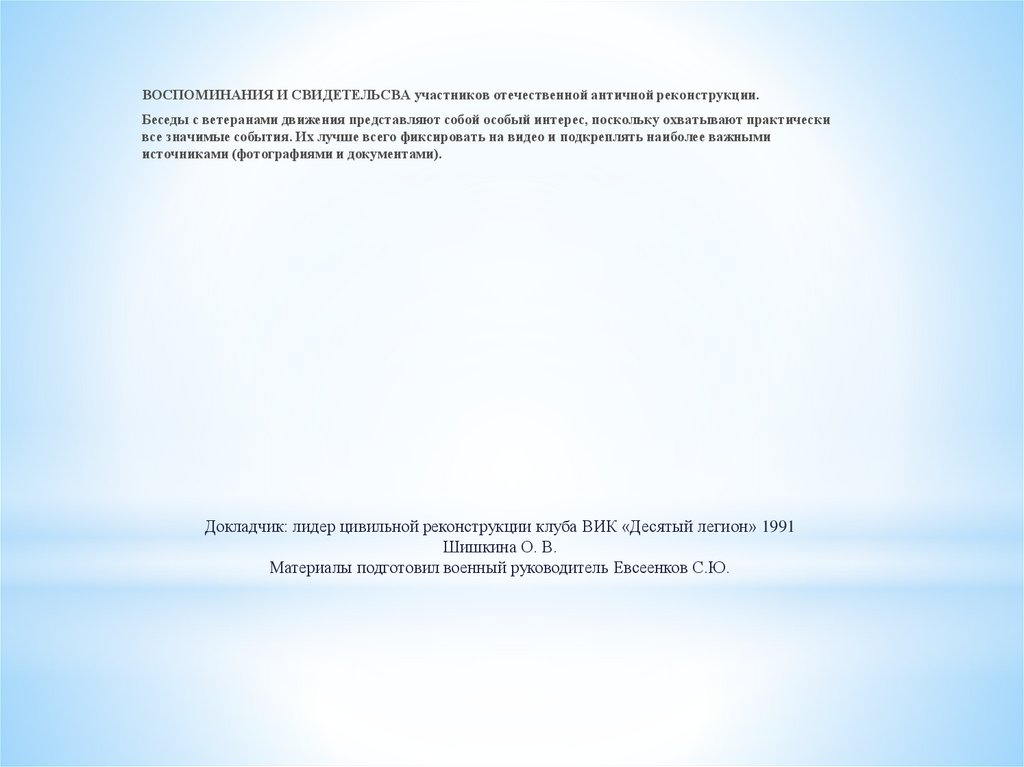 ВОСПОМИНАНИЯ И СВИДЕТЕЛЬСВА участников отечественной античной реконструкции.Беседы с ветеранами движения представляют собой особый интерес, поскольку охватывают практически