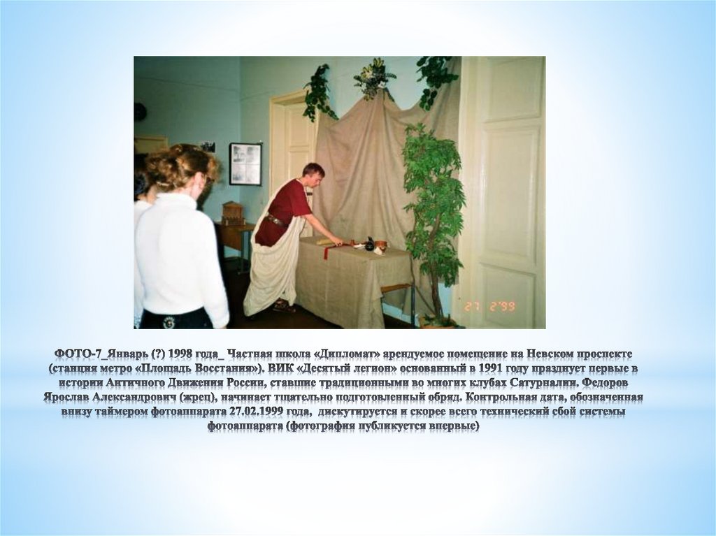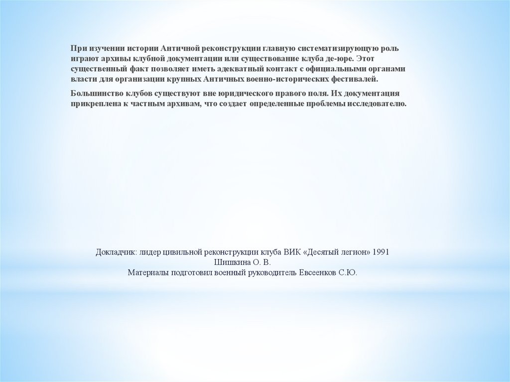 При изучении истории Античной реконструкции главную систематизирующую рольиграют архивы клубной документации или существование клуба де-юре. Этот