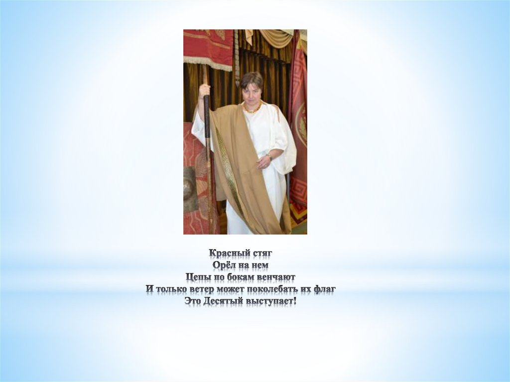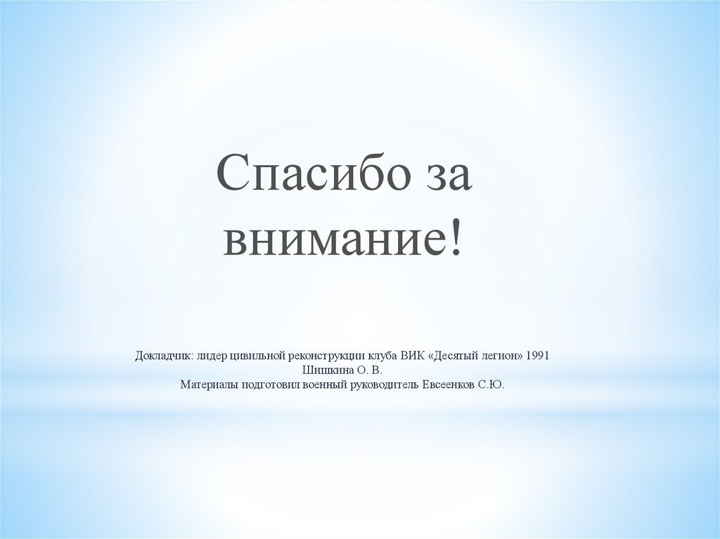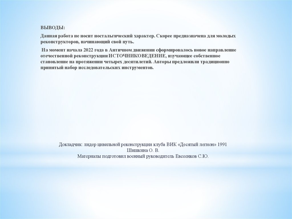 Докладчик: лидер цивильной реконструкции клуба ВИК «Десятый легион» 1991Шишкина О. В.