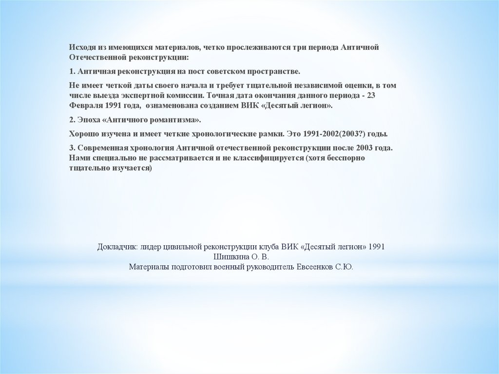Исходя из имеющихся материалов, четко прослеживаются три периода АнтичнойОтечественной реконструкции: