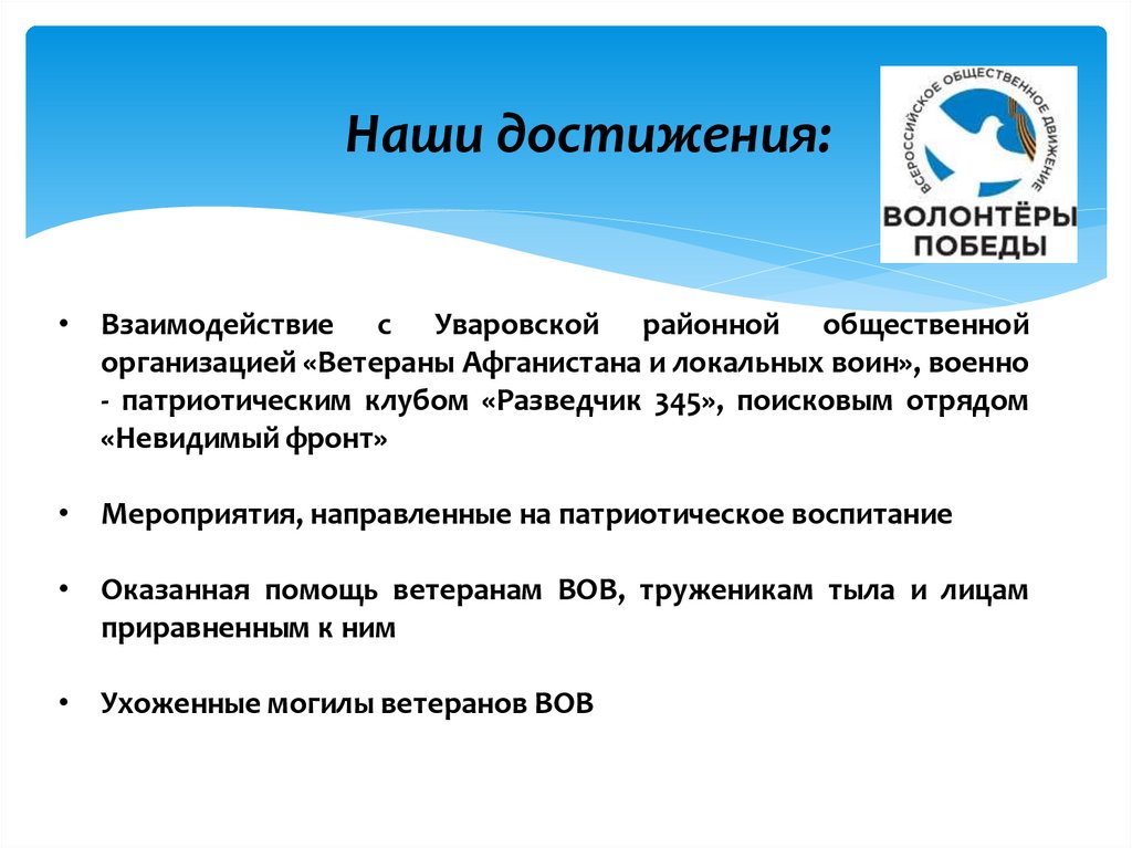 Наши достижения:• Взаимодействие с Уваровской районной общественной