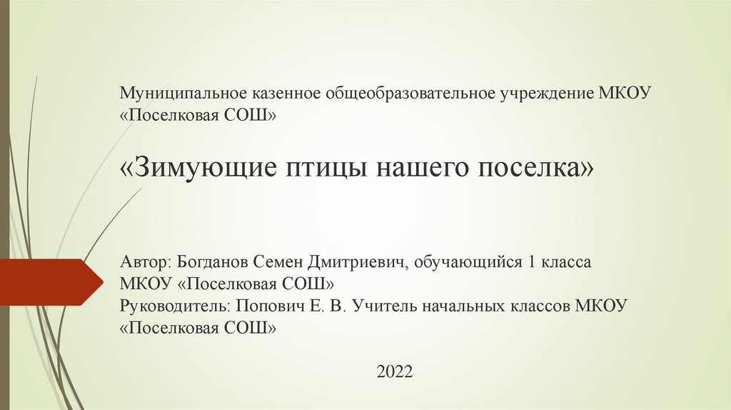 Руководитель: Попович Е. В. Учитель начальных классов МКОУ