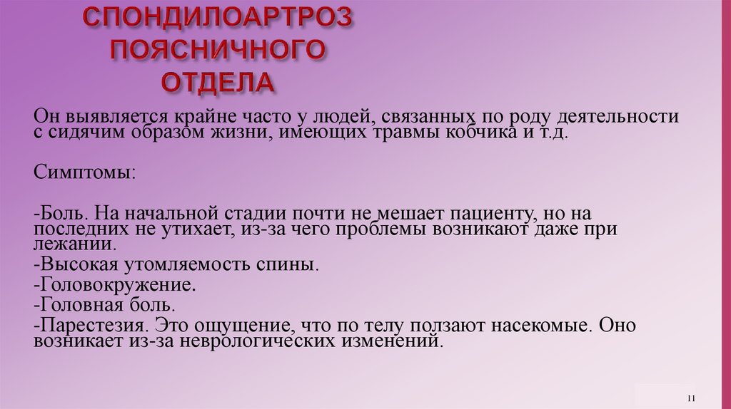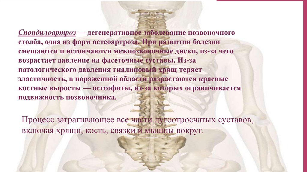 Спондилоартроз — дегенеративное заболевание позвоночногостолба, одна из форм остеоартроза. При развитии болезни