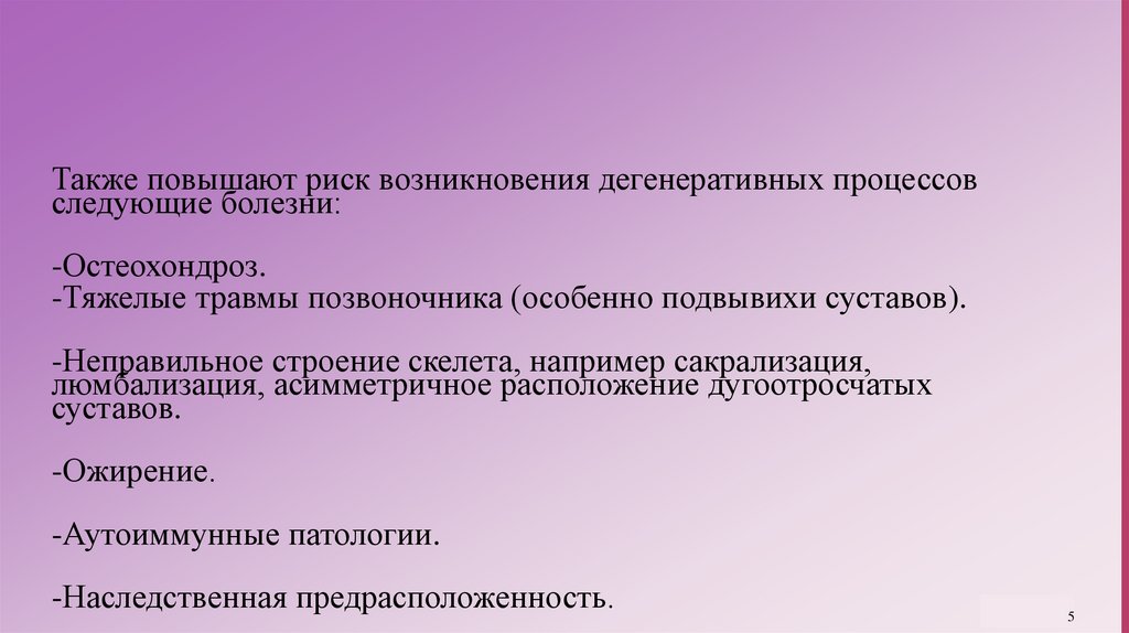 Также повышают риск возникновения дегенеративных процессовследующие болезни: