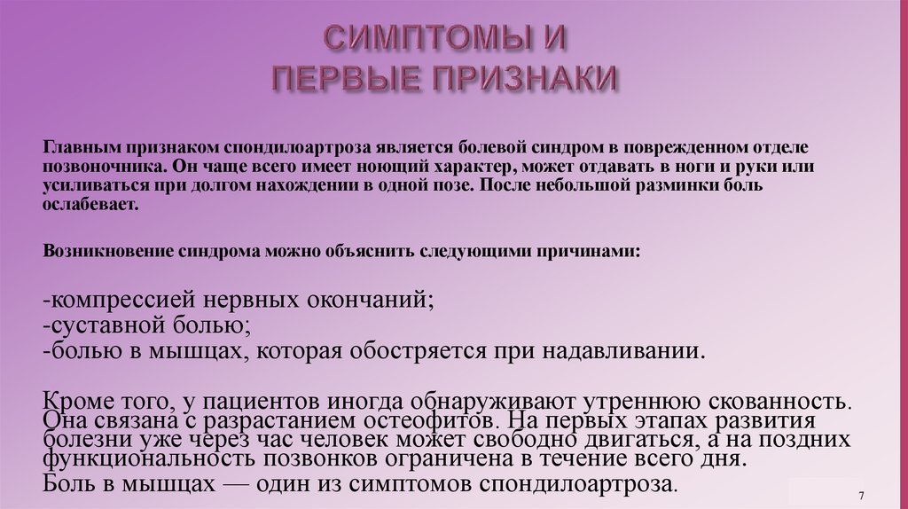 Главным признаком спондилоартроза является болевой синдром в поврежденном отделепозвоночника. Он чаще всего имеет ноющий характер, может отдавать в ноги и руки или