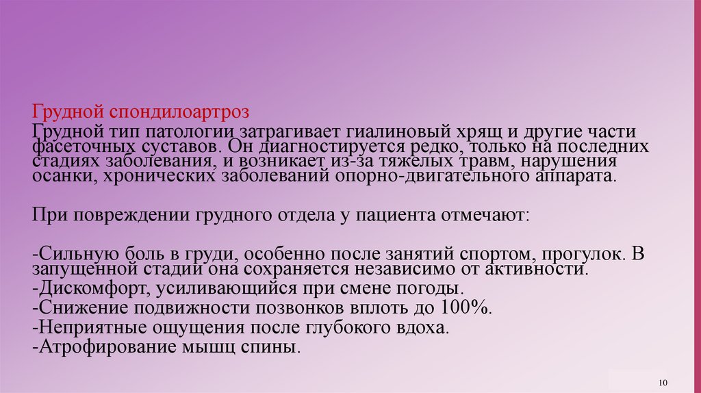 Грудной спондилоартрозГрудной тип патологии затрагивает гиалиновый хрящ и другие части