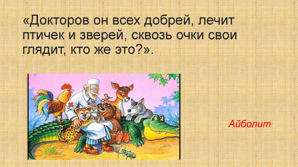 «Докторов он всех добрей, лечитптичек и зверей, сквозь очки свои