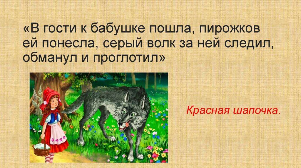 «В гости к бабушке пошла, пирожковей понесла, серый волк за ней следил,