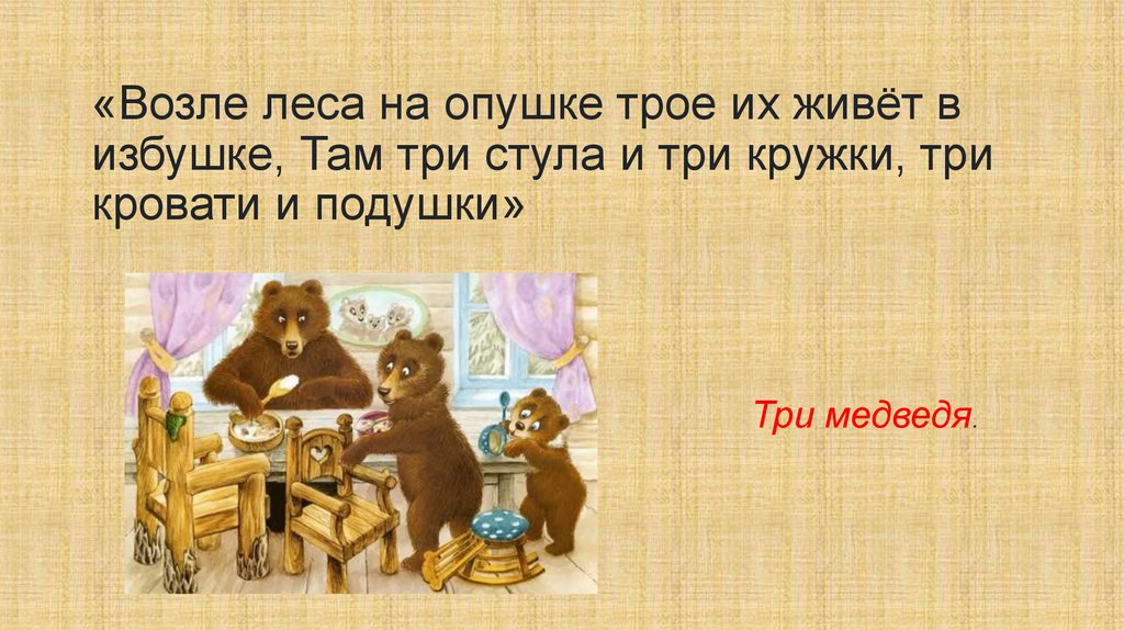 «Возле леса на опушке трое их живёт визбушке, Там три стула и три кружки, три