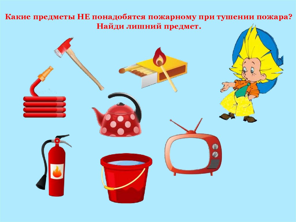 Какие предметы НЕ понадобятся пожарному при тушении пожара?Найди лишний предмет.