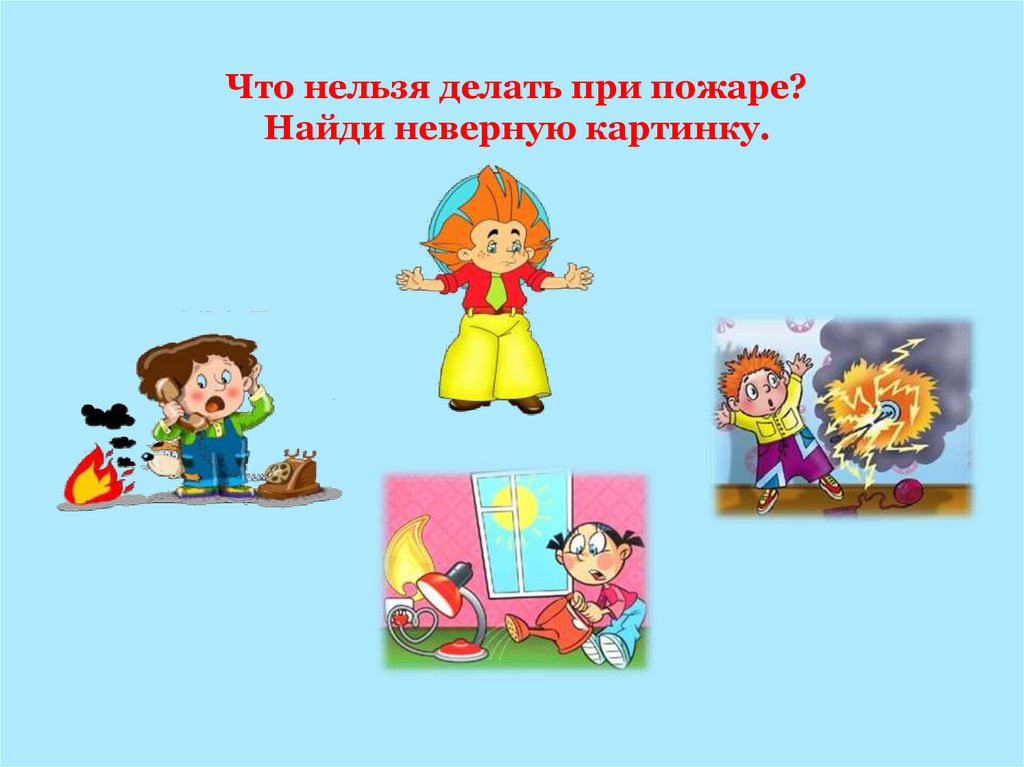 Что нельзя делать при пожаре?Найди неверную картинку.