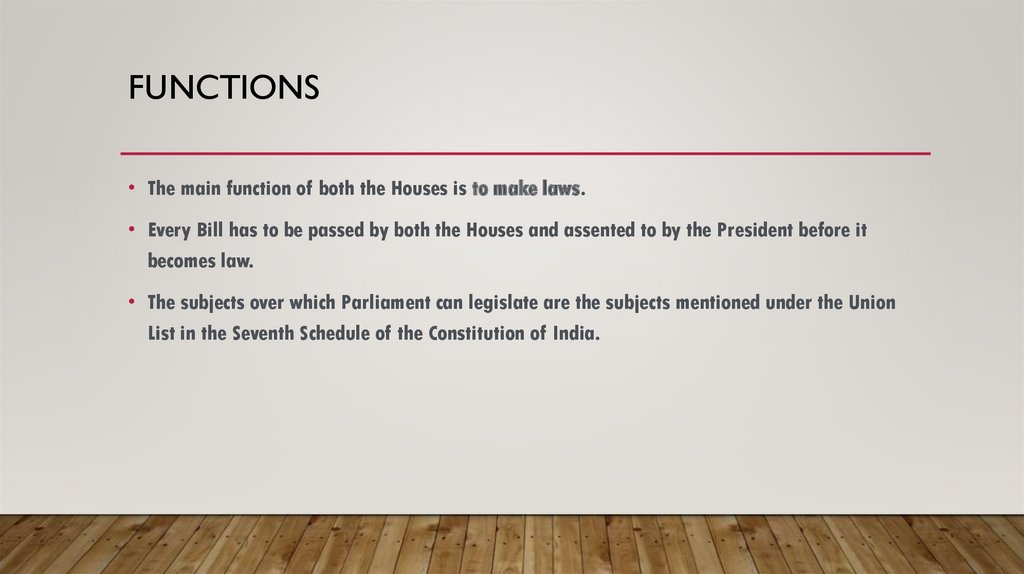 FUNCTIONS• The main function of both the Houses is to make laws.