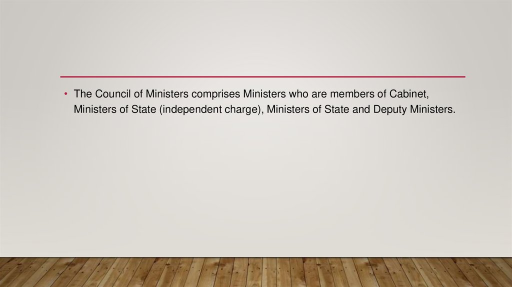 • The Council of Ministers comprises Ministers who are members of Cabinet,Ministers of State (independent charge), Ministers of State and Deputy Ministers.