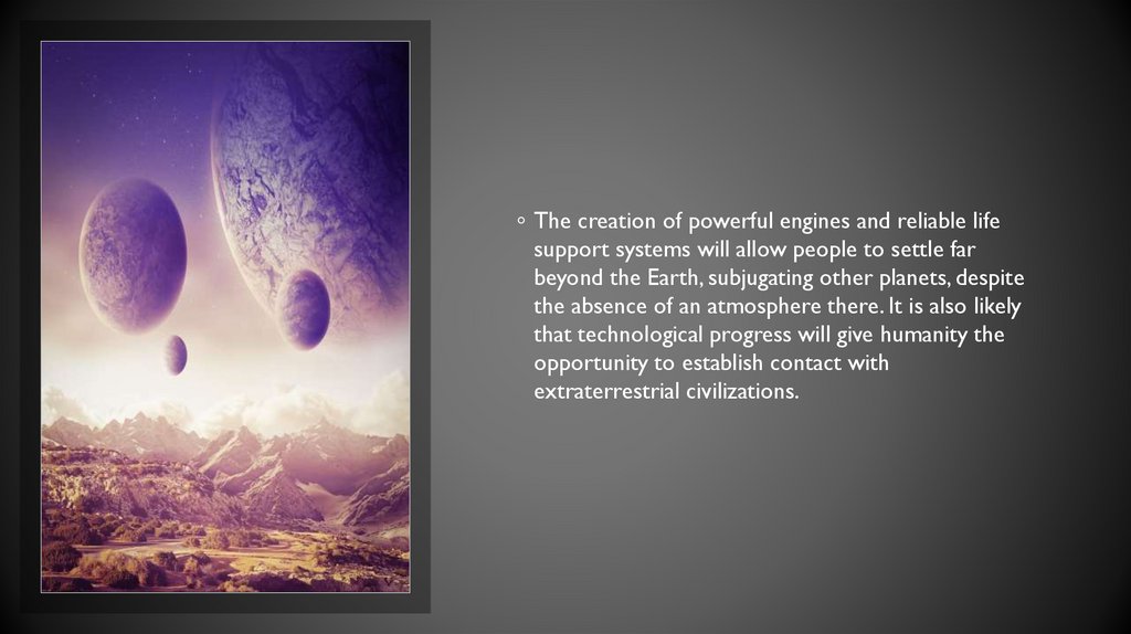 ◦ The creation of powerful engines and reliable lifesupport systems will allow people to settle far