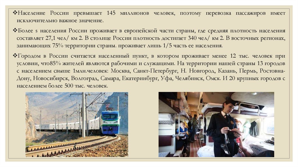 Население России превышает 145 миллионов человек, поэтому перевозка пассажиров имеетисключительно важное значение.