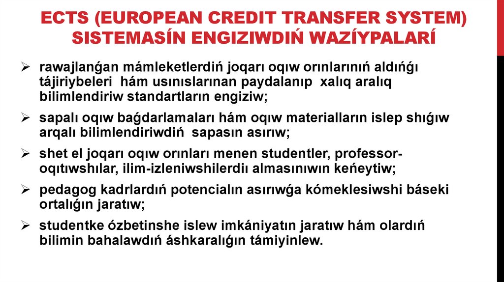 ECTS (EUROPEAN CREDIT TRANSFER SYSTEM)SISTEMASÍN ENGIZIWDIŃ WAZÍYPALARÍ