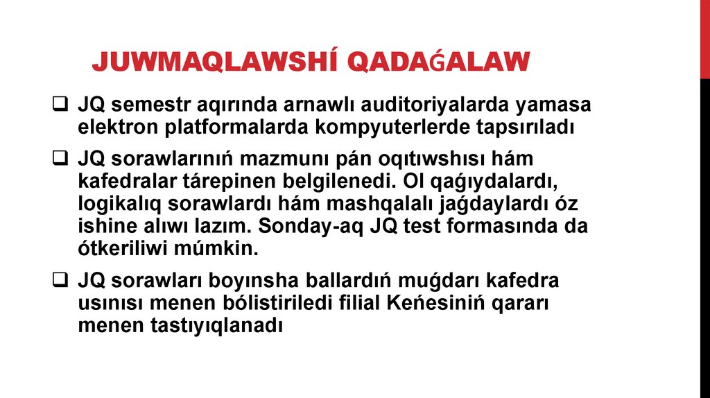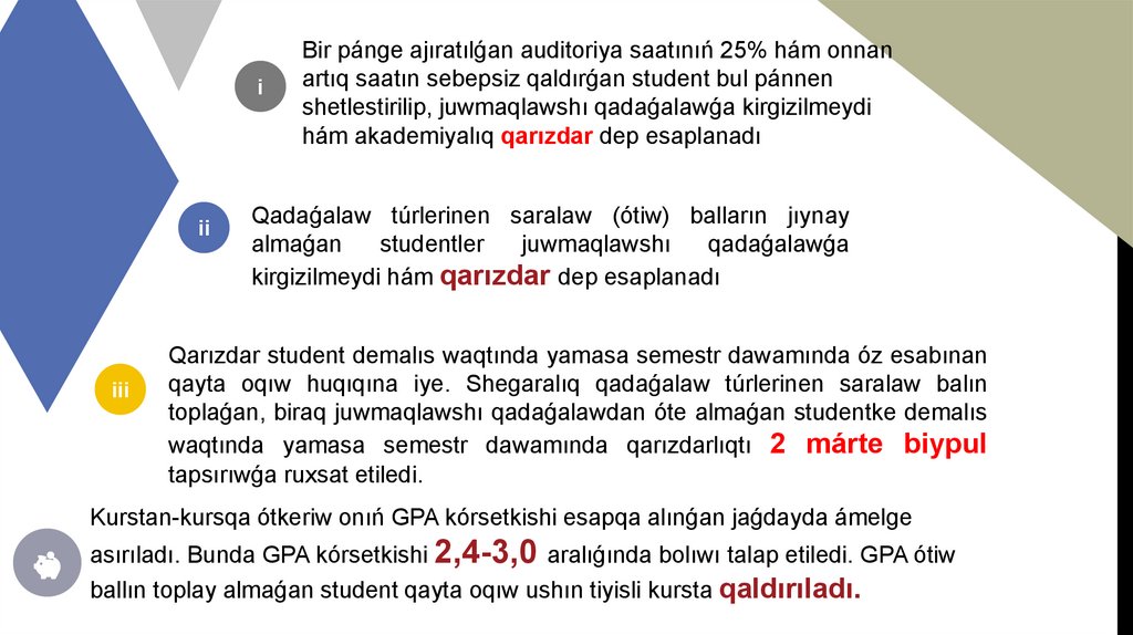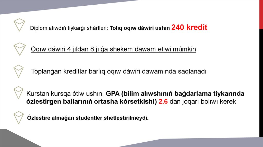 asırıladı. Bunda GPA kórsetkishi 2,4-3,0 aralıǵında bolıwı talap etiledi. GPA ótiw