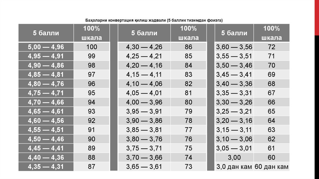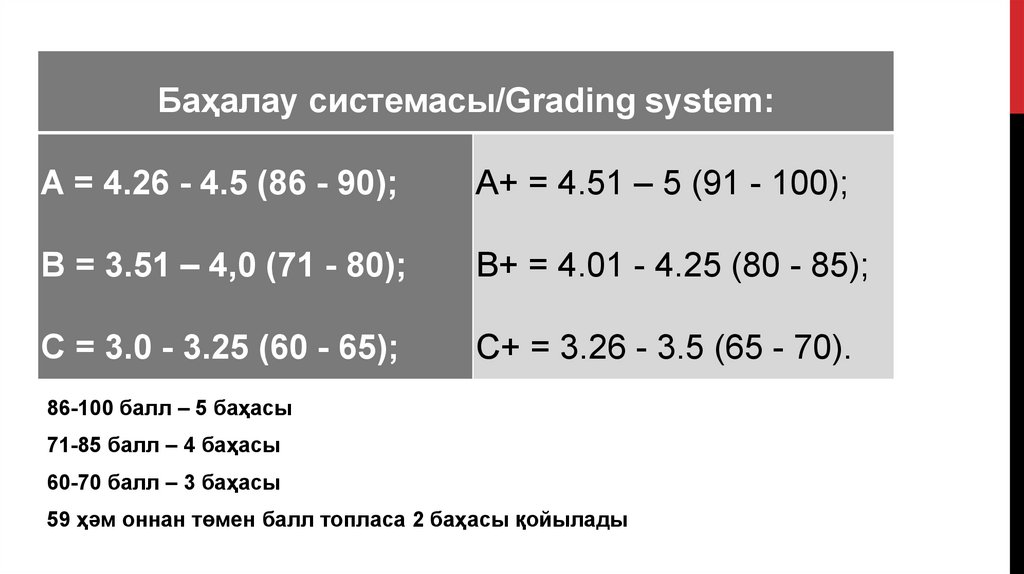 Баҳалау системасы/Grading system:A = 4.26 - 4.5 (86 - 90);