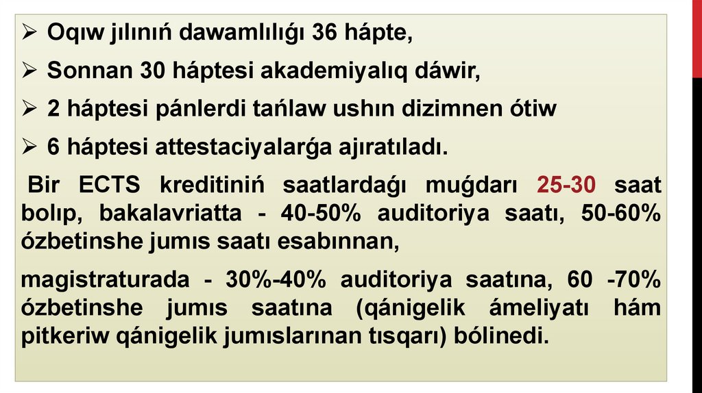 Oqıw jılınıń dawamlılıǵı 36 hápte,Sonnan 30 háptesi akademiyalıq dáwir,