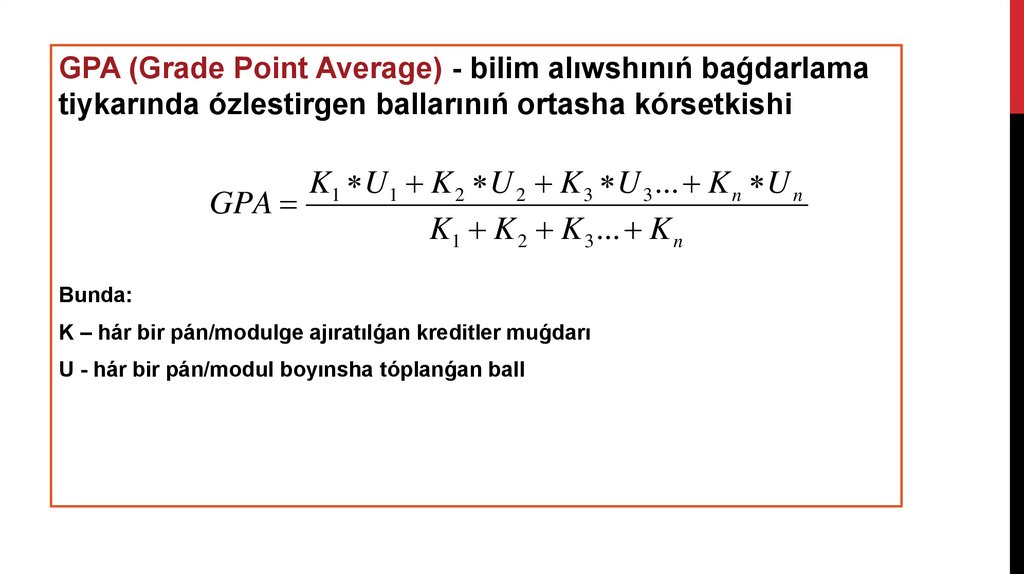 GPA (Grade Point Average) - bilim alıwshınıń baǵdarlamatiykarında ózlestirgen ballarınıń ortasha kórsetkishi