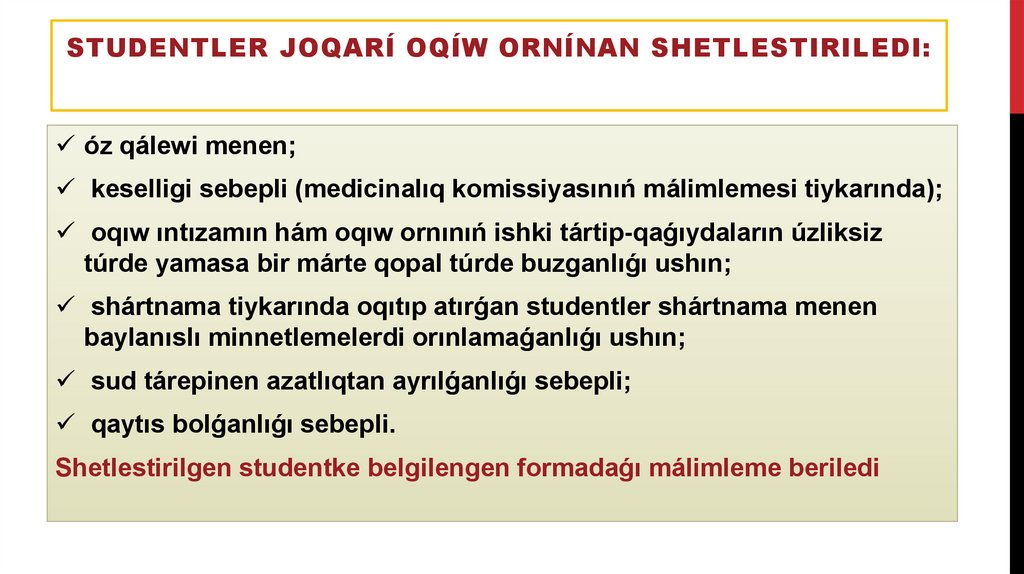 Ózlestire almaǵan studentler shetlestirilmeydi.
