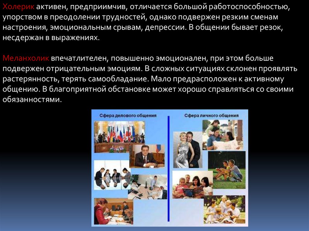 Холерик активен, предприимчив, отличается большой работоспособностью,упорством в преодолении трудностей, однако подвержен резким сменам