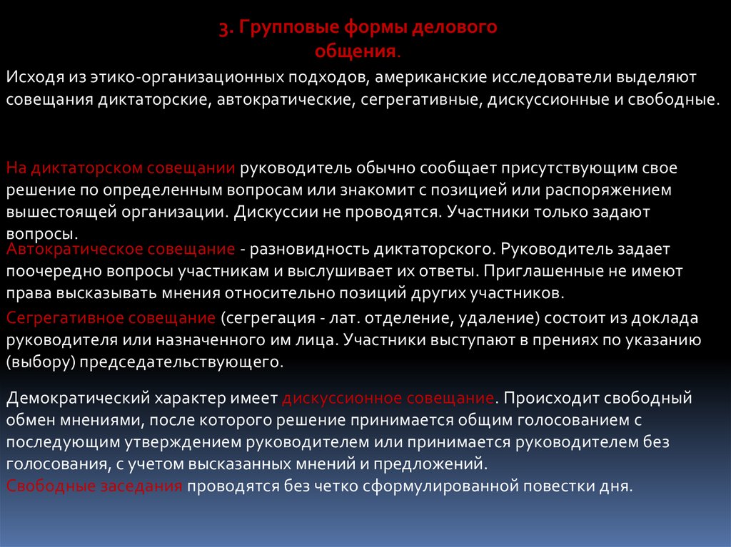 совещания диктаторские, автократические, сегрегативные, дискуссионные и свободные.