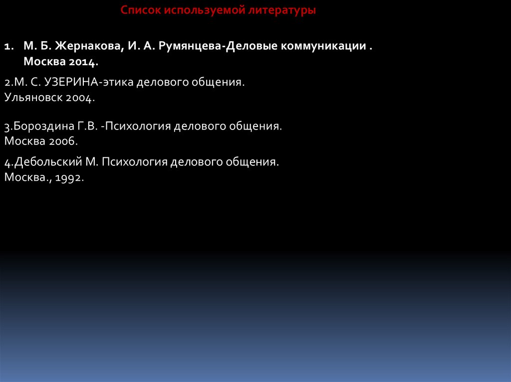 Список используемой литературы1. М. Б. Жернакова, И. А. Румянцева-Деловые коммуникации .