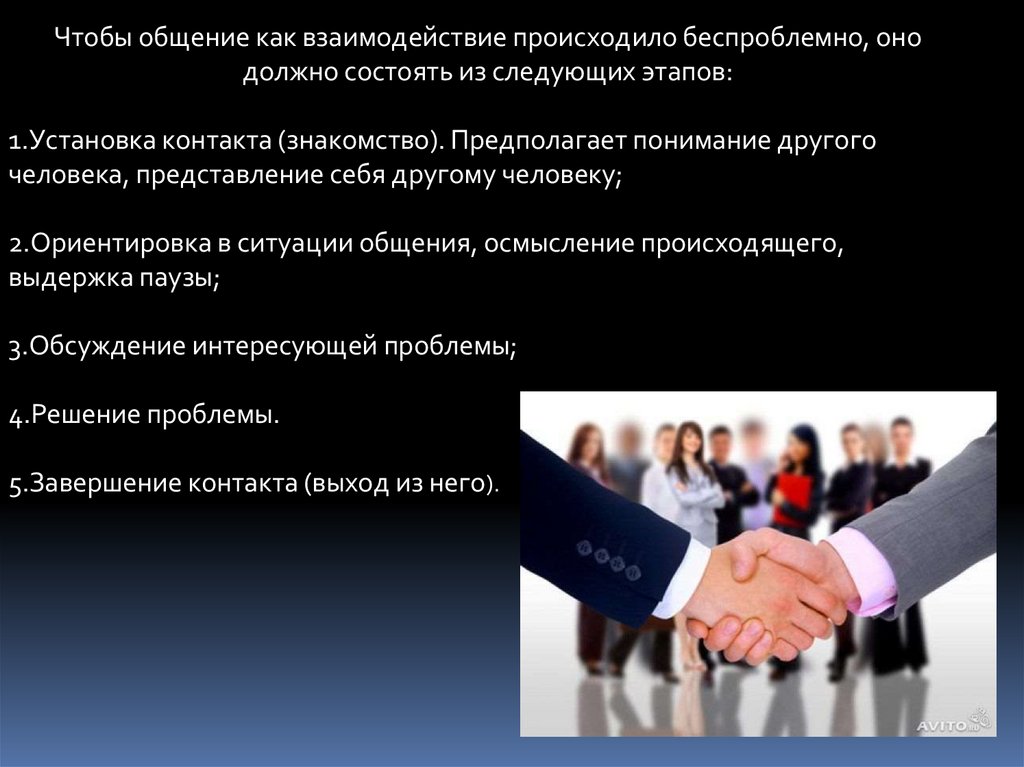 Чтобы общение как взаимодействие происходило беспроблемно, онодолжно состоять из следующих этапов: